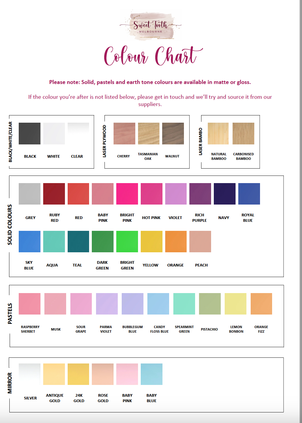 Please include your colour selection and details of your sign in the order notes at checkout. Alternatively please email details to sweettoothmelb@gmail.com