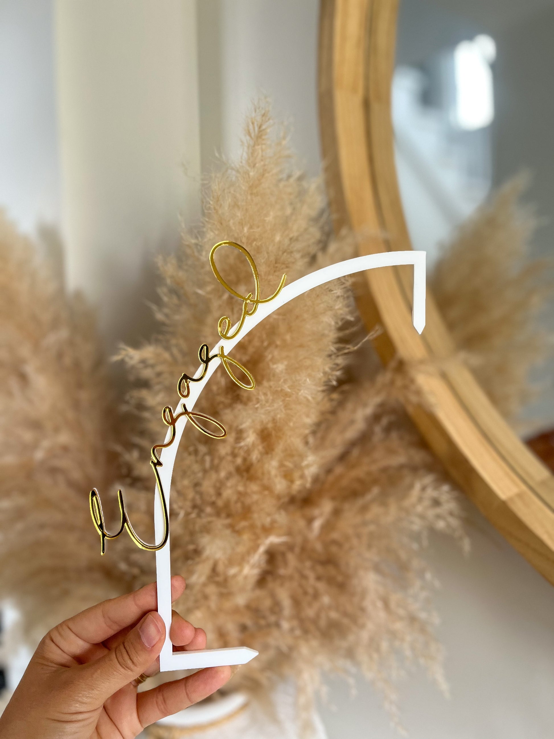This arch cake topper is double layered, with a clear backing and trimming & name/message in your choice of coloured acrylic.