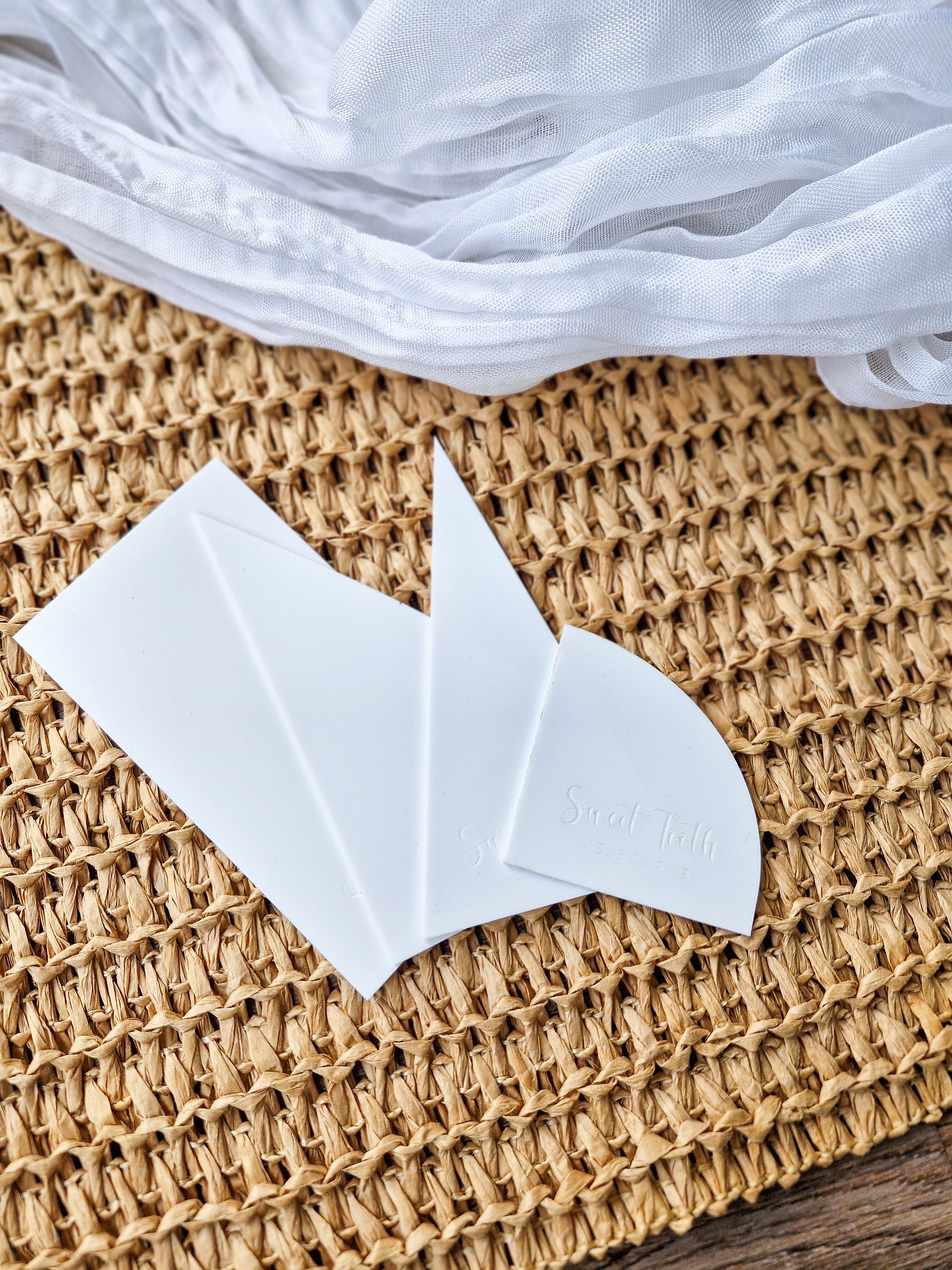 A set of four white, mini acrylic scrapers - 1mm in thickness - to provide you with the perfect tools to finesse those buttercream cakes. Straight edges, clean boards, last minute touchups and details - these will do all that for you and more.